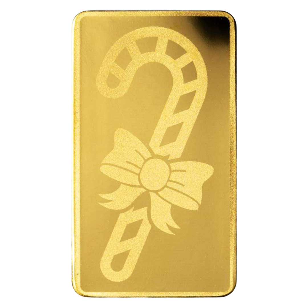 The obverse displays a charming candy cane with ribbon, symbolizing the joy and warmth of the holidays. The reverse includes a delicate ribbon motif with the bar’s weight and purity elegantly inscribed below. Whether given as a gift or added to your own stack, this collectible gold bar captures the festive spirit of the season in precious form.