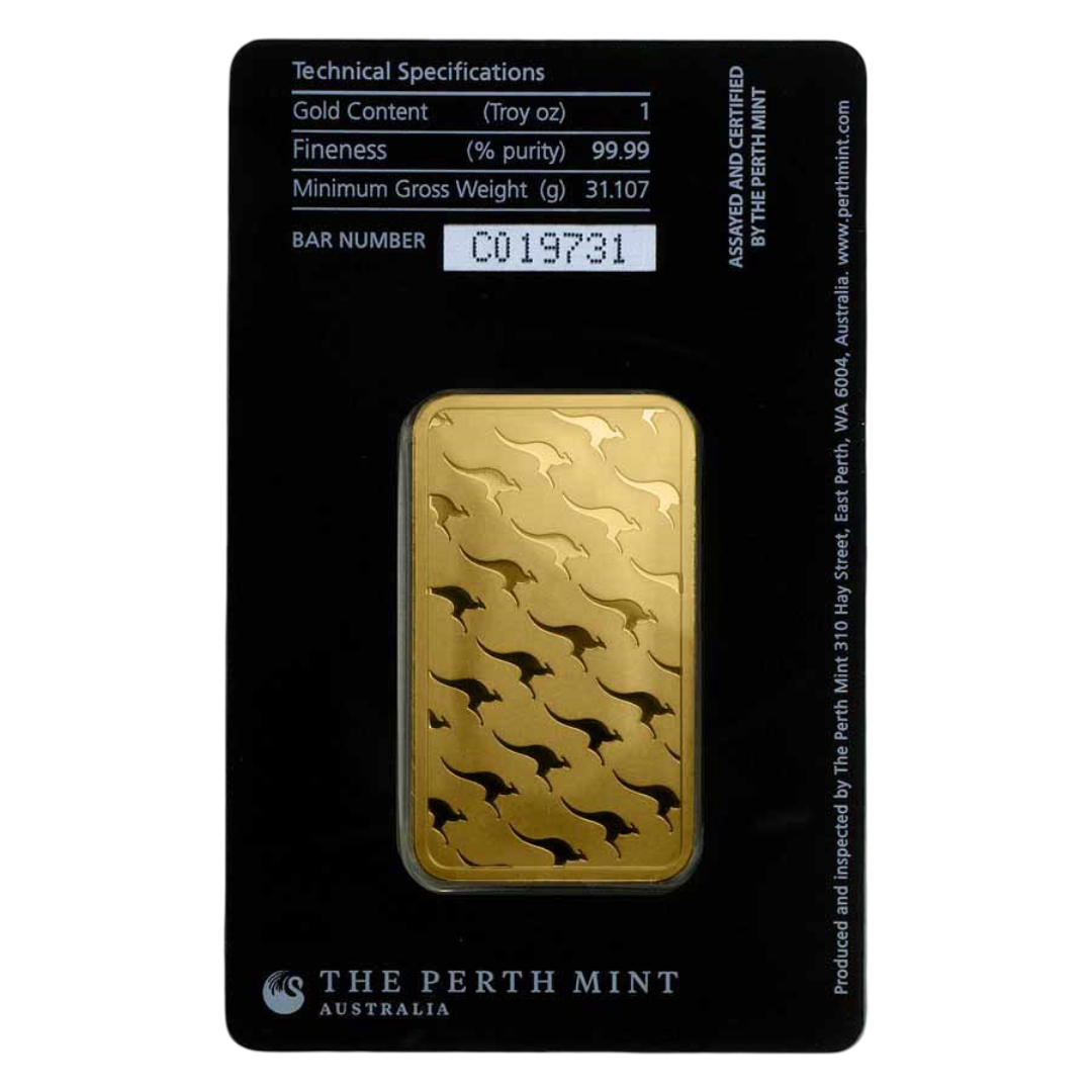 The Perth Mint 1 oz Gold Bar embodies the heritage of Australian gold refining and the mint’s century-long reputation for purity and craftsmanship. Each bar is meticulously struck from .9999 fine 24-karat gold and sealed within a tamper-evident assay card listing its weight, purity, and authentication by the assayer.