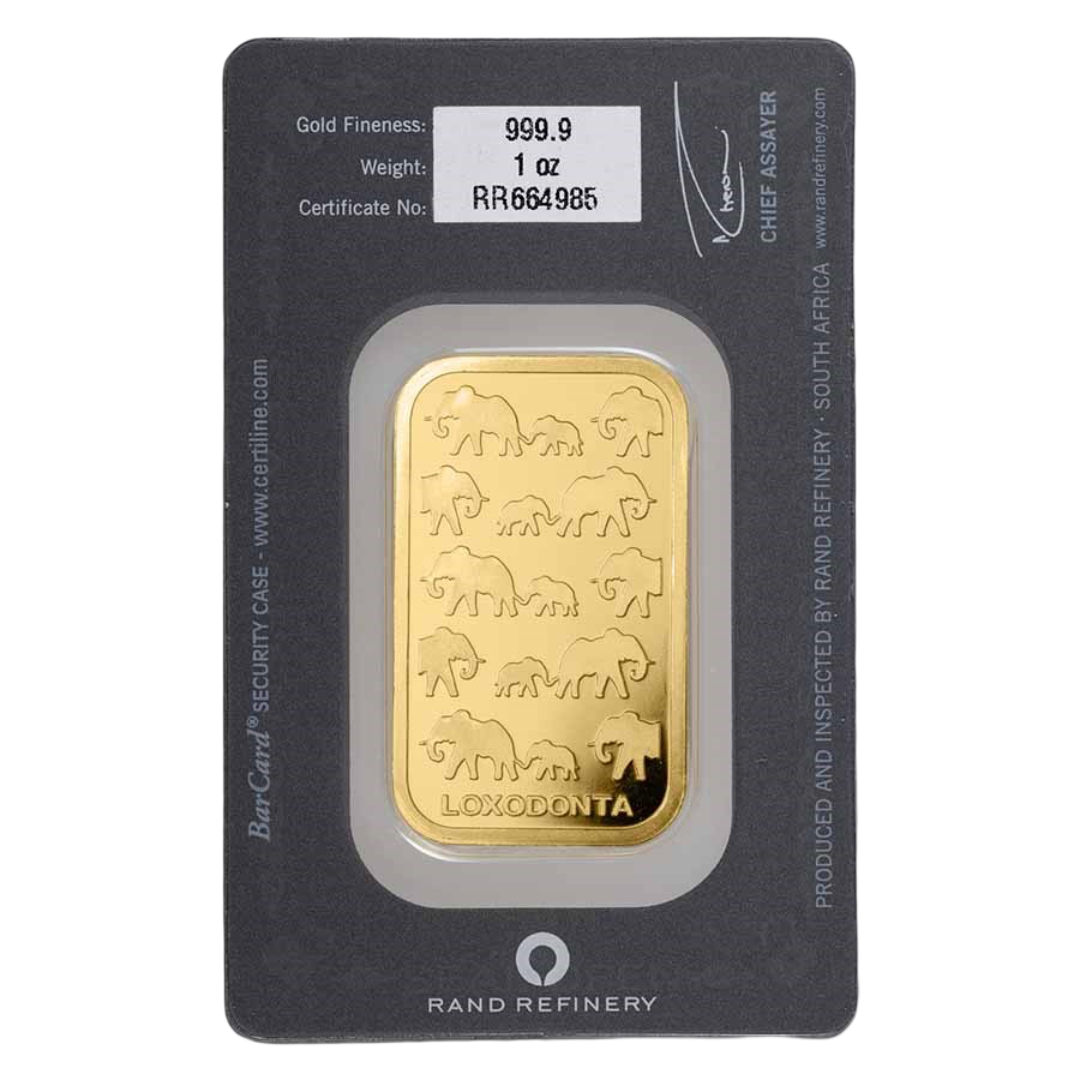 The Rand Refinery 1 oz Gold Bar combines African heritage with world-class bullion standards. Struck from .9999 fine 24-karat gold, each bar arrives sealed in a sleek, tamper-evident black assay card that lists metal, weight, fineness, and a matching serial number for quick authentication. The obverse features a dynamic procession of elephants, while the reverse displays official Rand Refinery branding with full specifications.