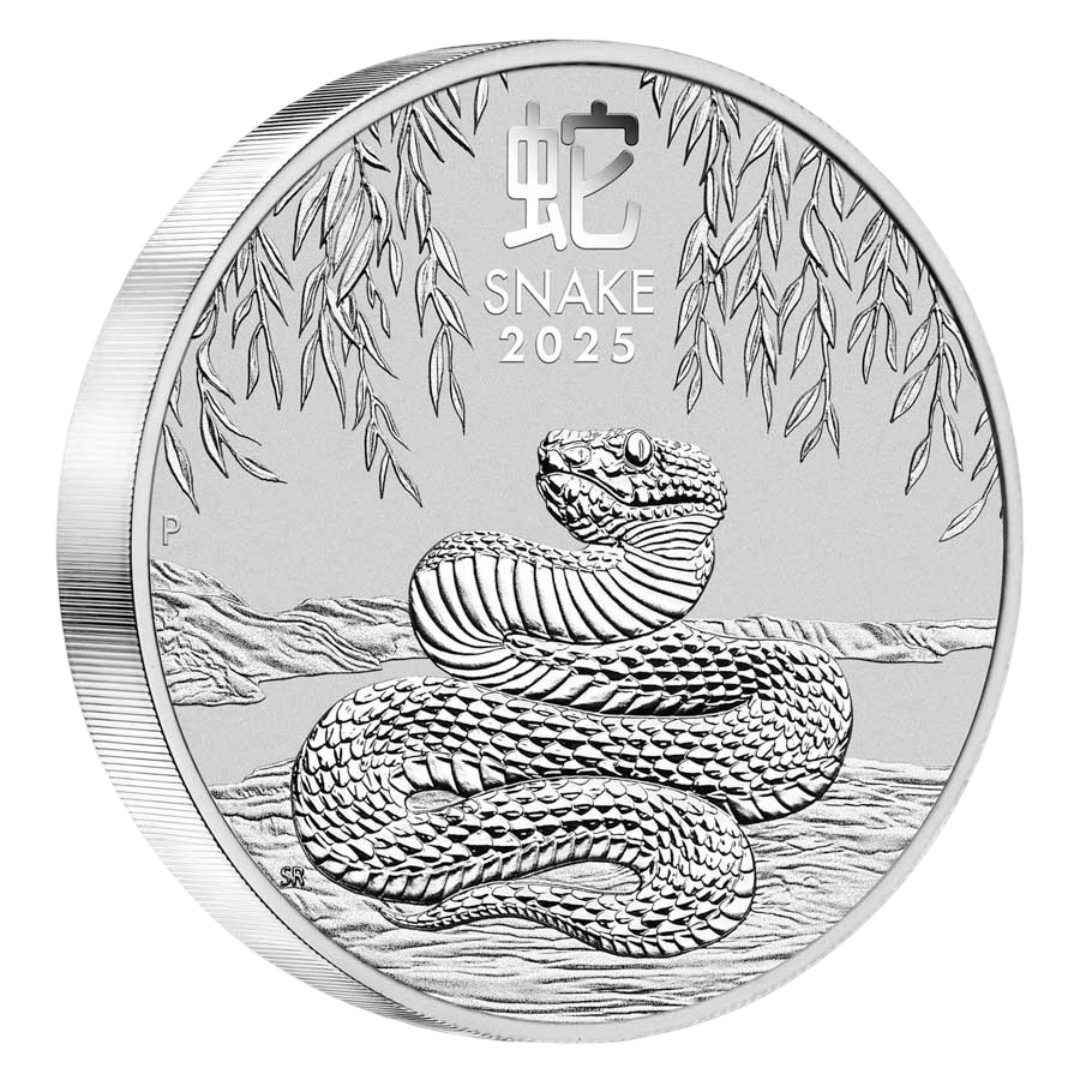 The reverse showcases a snake coiled beneath hanging leaves, evoking themes of wisdom, intuition, resilience and transformation. The design includes the Chinese character for “snake,” the inscription “SNAKE 2025” and The Perth Mint’s “P” mint mark.
